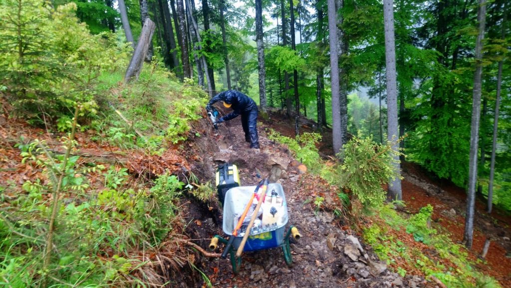 Was man nicht vergessen darf ist, dass hinter dem Trailbau mehr steckt als cool im Wald zu stehen und fette Sprünge zu bauen. Es geht los mit Erstgesprächen mit TVB‘s und Bergbahnen, Geländebegehungen, sowie dem Ausstecken und Vermessen von Linien und dem Vorbereiten von Einreichverfahren. Erst dann kommt es zum eigentlichen Bau.
