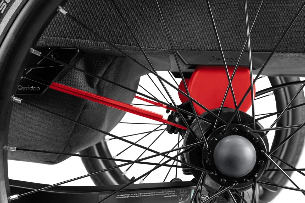 Im Fahrbetrieb überzeugt der Qeridoo Kidgoo 2 FIDLOCK Edition bei entsprechend umsichtiger Fahrweise durch eine ausgewogene Kombination aus Laufruhe, Spurtreue und Federkomfort. Die groß dimensionierten 20-Zoll-Laufräder mit Aluminiumfelgen und pannensicheren Luftreifen sorgen für geringe Rollwiderstände und ein stabiles Fahrverhalten – sowohl auf Asphalt als auch auf unebenen Wegen. Wir waren auch abseits asphaltierter Wege gut unterwegs, nahmen jedoch, je nach Beladung & Untergrund, Tempo raus. Das integrierte Blattfeder-Dämpf-System (BDS) bietet eine adaptive Federung, die das Fahrwerk automatisch auf unterschiedliche Beladungen und Untergründe anpasst, dies funktioniert ohne manuelles Nachjustieren gut.