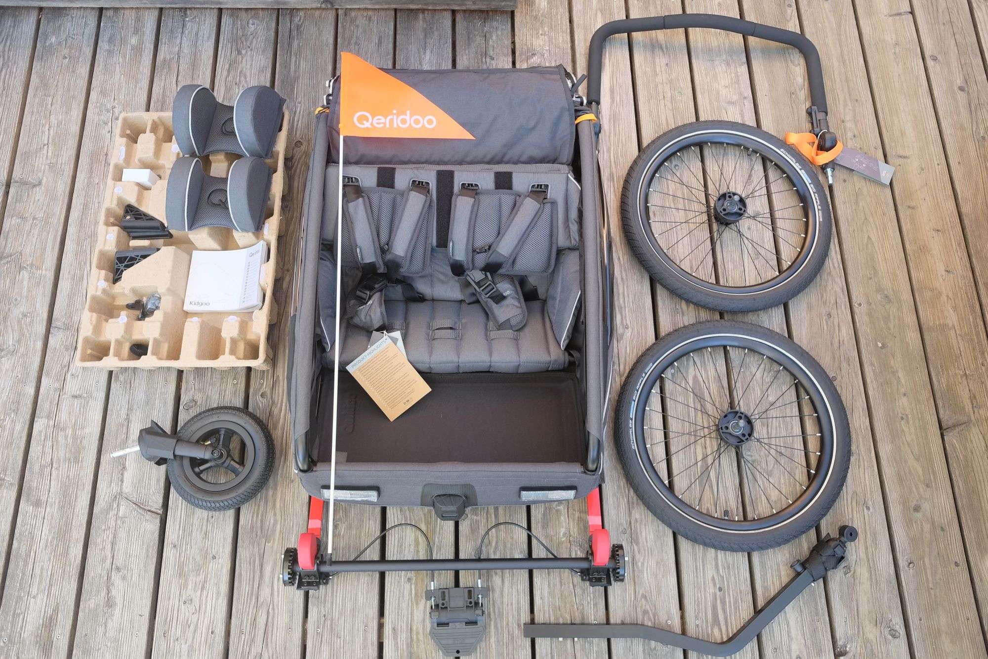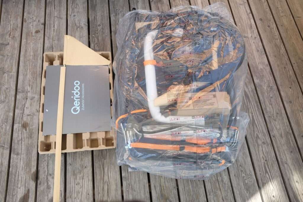 Der Aufbau des Qeridoo Kidgoo 2 FIDLOCK Edition gestaltet sich überraschend unkompliziert – selbst für Eltern, die zum ersten Mal einen Kindersportwagen in Betrieb nehmen. Dank durchdachter Faltmechanik und vormontierter Komponenten ist der Kindersportwagen nach ein wenig Handarbeit einsatzbereit. Konkret müssen die Hinterachse (vier Schrauben), die Parkbremse (zwei Schrauben) und der Sicherungsbolzen für die Deichselaufnahme montiert werden.
