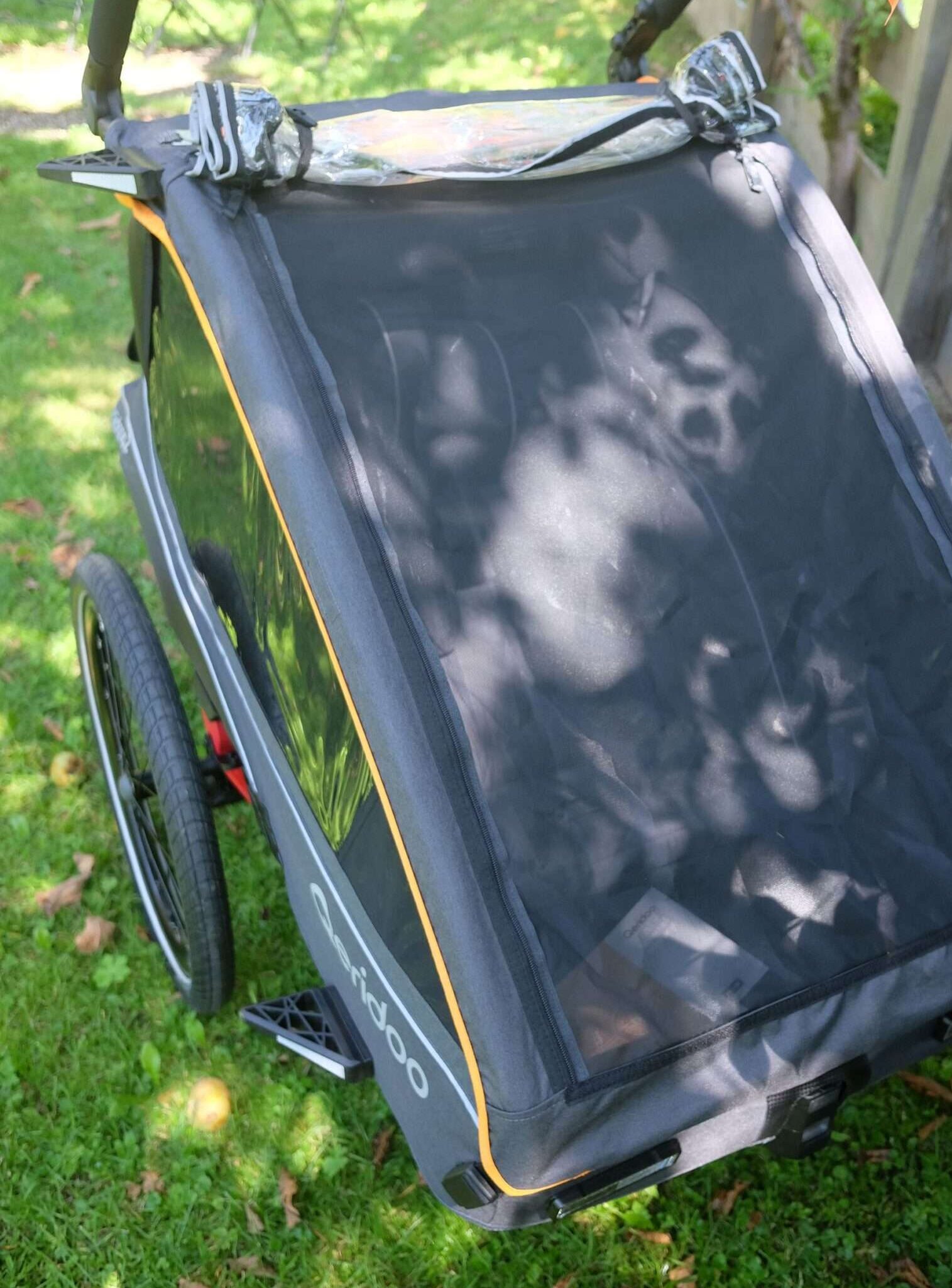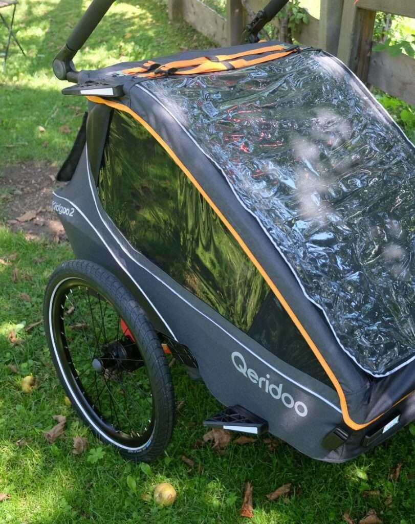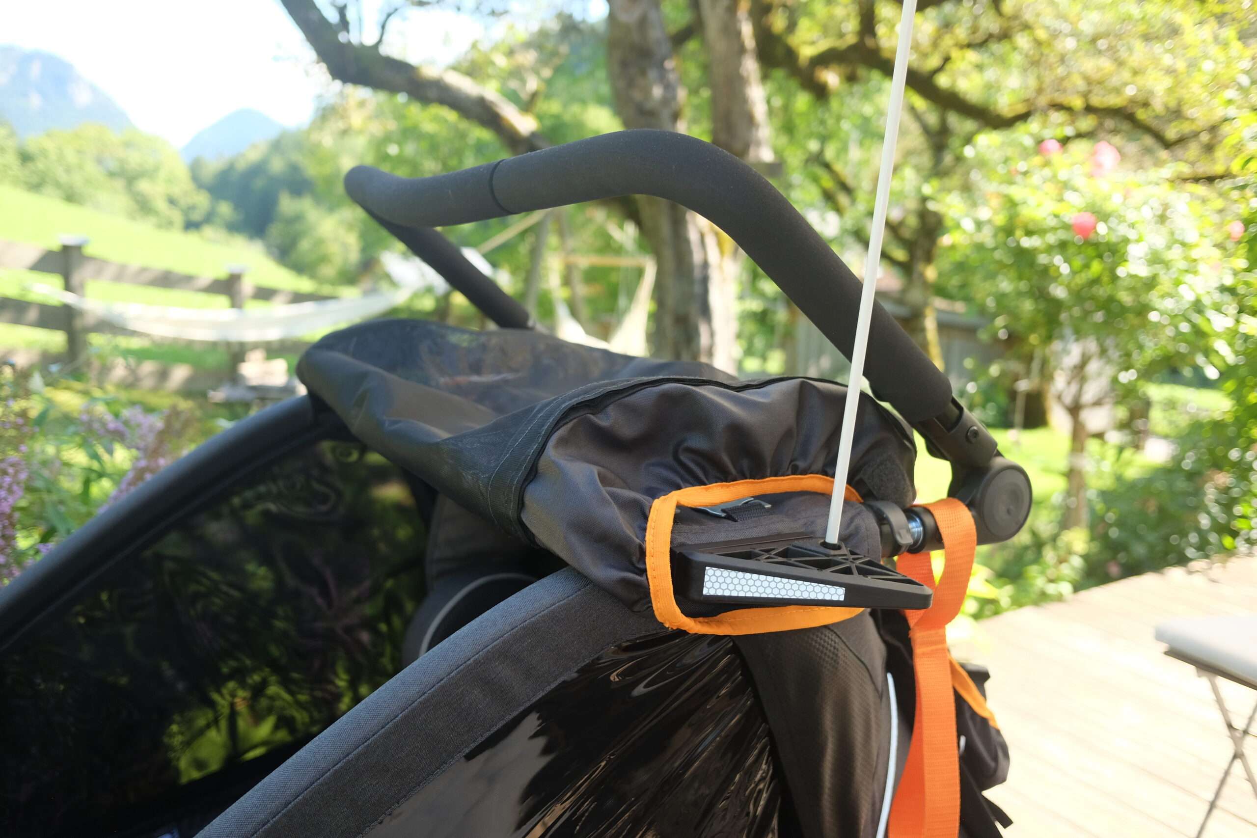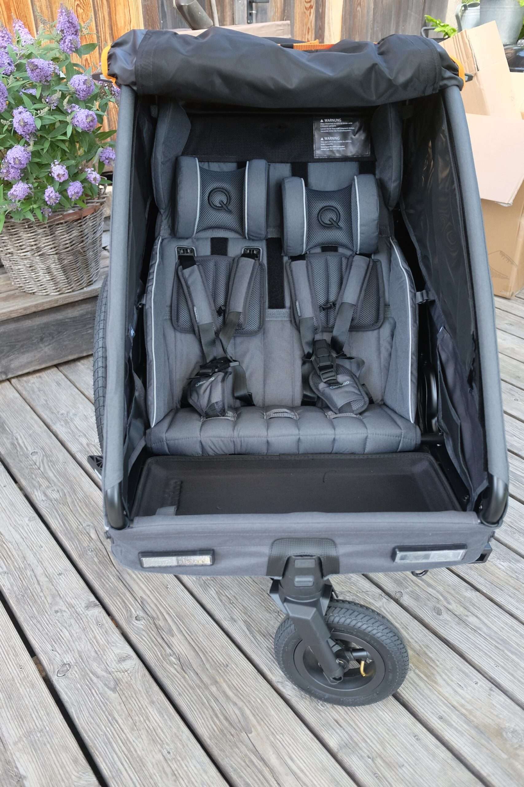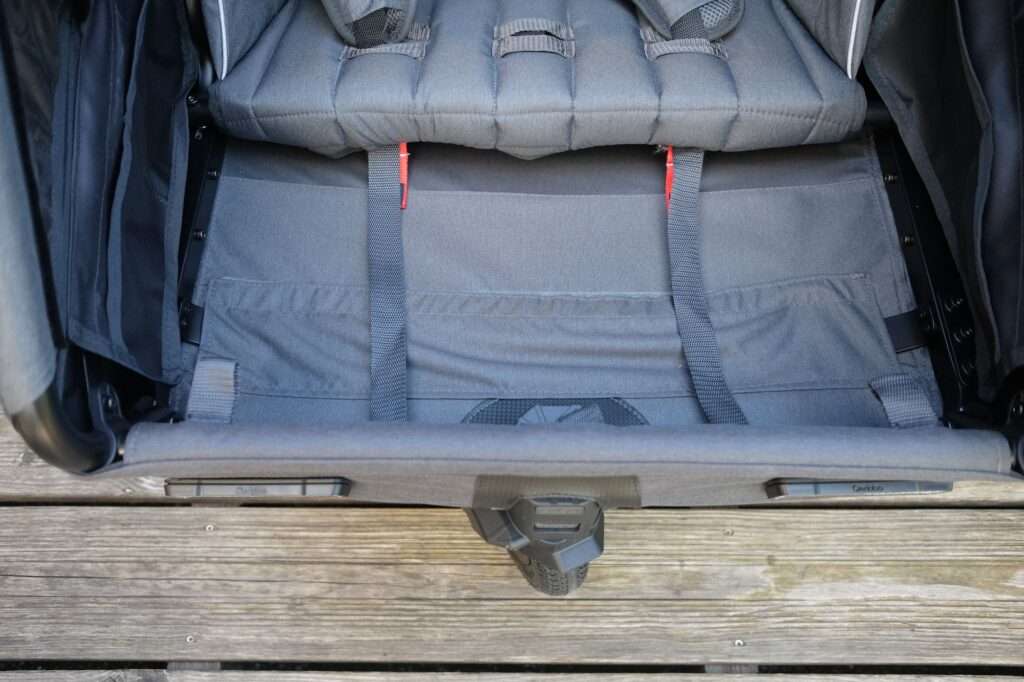 Besonders auffällig ist das FIDLOCK-System, das mit seinen magnet-mechanischen Verschlüssen ein präzises und gleichzeitig komfortables Handling ermöglicht – etwa beim Anbringen des Verdecks oder beim Justieren der Sicherheitsgurte. Auch die Montage der 20-Zoll-Laufräder mit Schnellspannachsen sowie die Anbringung der Deichsel an die Universalkupplung erfolgen werkzeuglos und passgenau. Einzig die Anbringung des Schiebebügels benötigte mehrere Anläufe und etwas Feingefühl; bei den ersten Versuchen ließ sich die linke Seite nicht richtig fixieren. Schließlich klappte es aber nach ein paar Versuchen doch noch und das Problem war behoben.