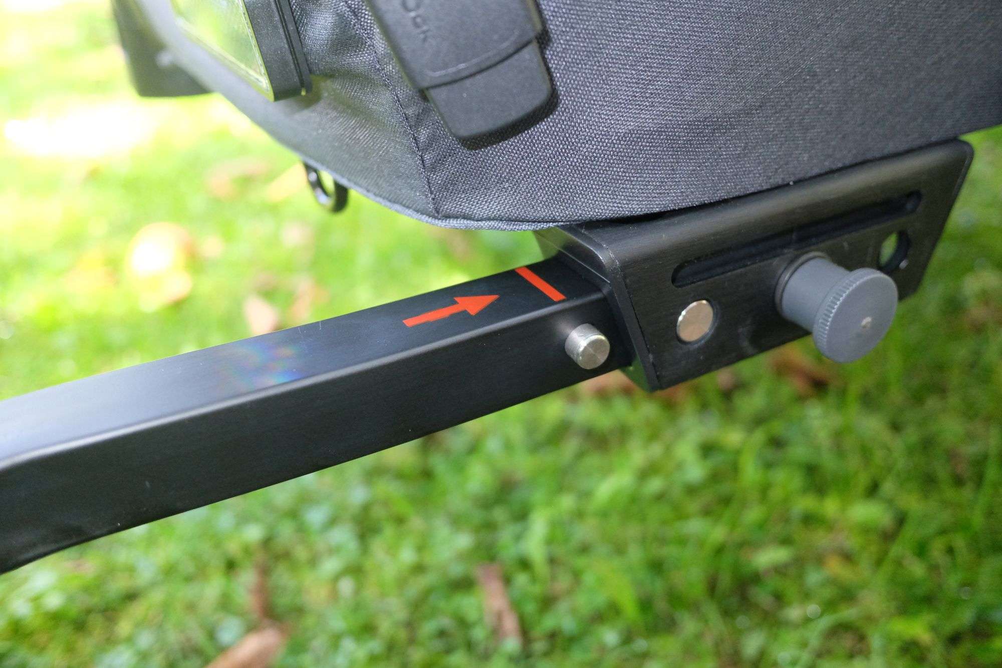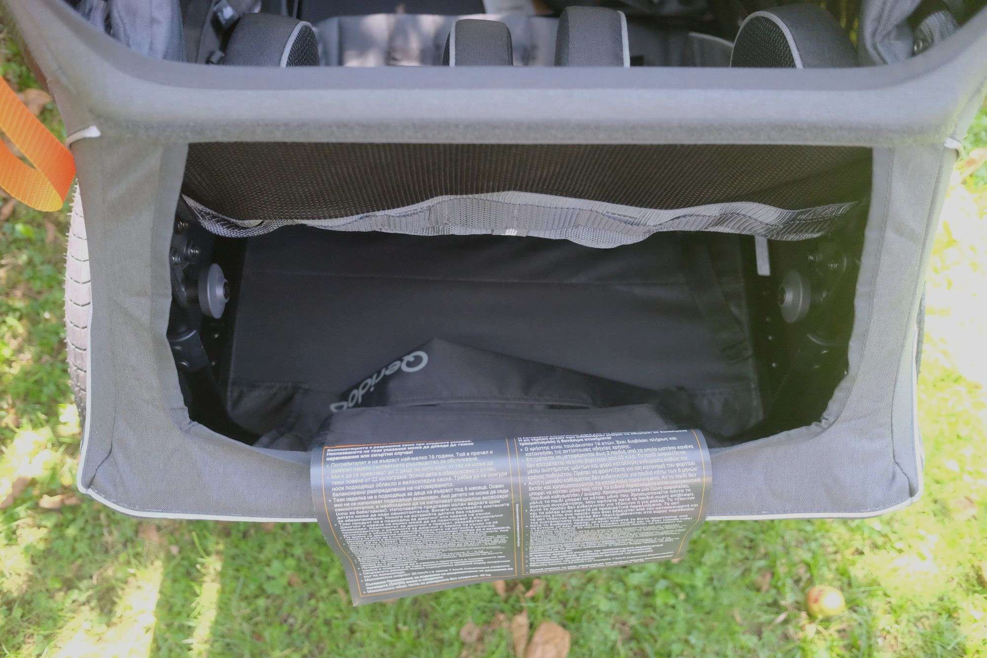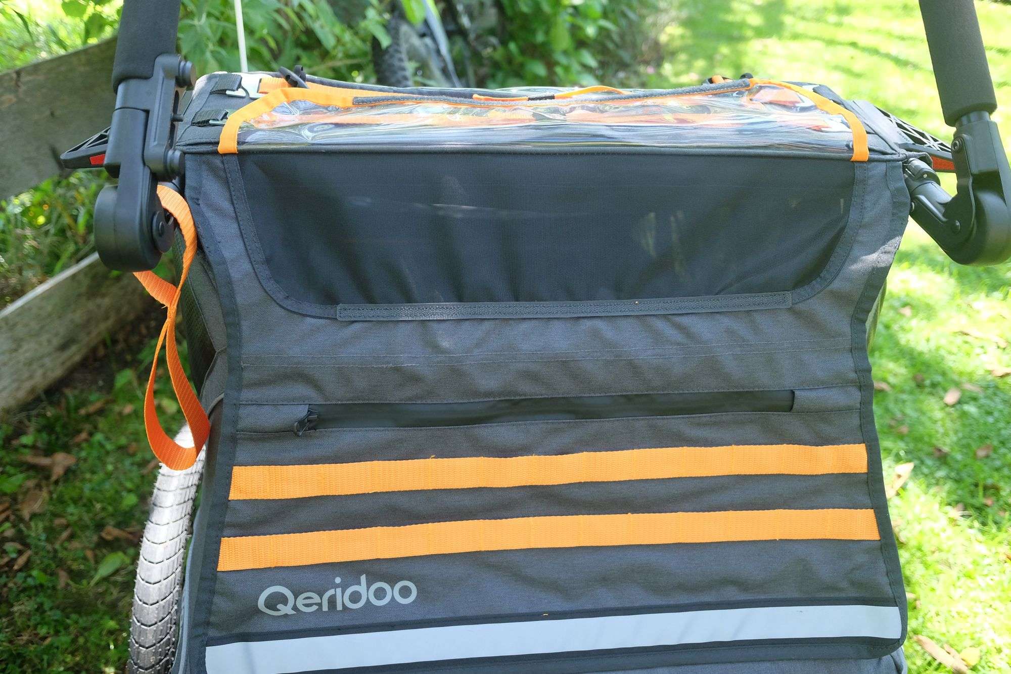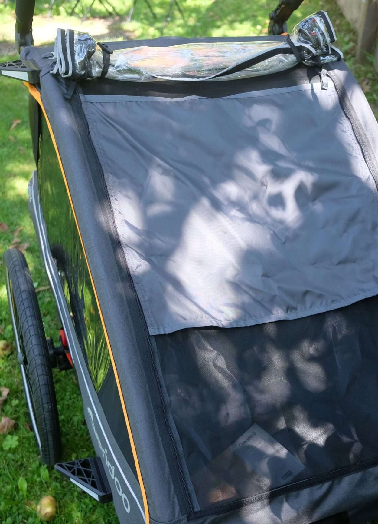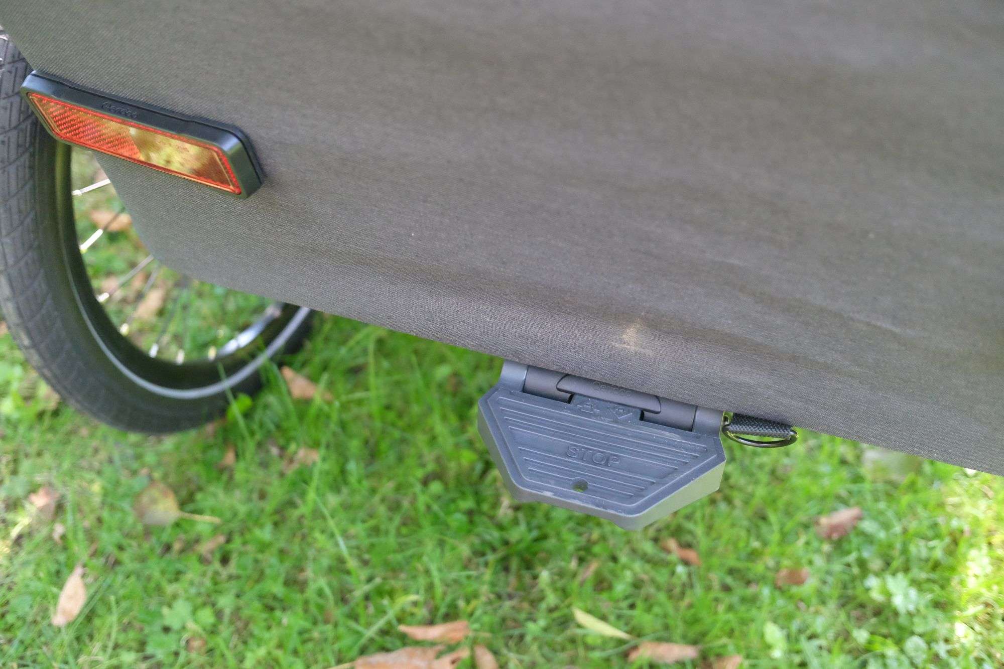 Besonders auffällig ist das FIDLOCK-System, das mit seinen magnet-mechanischen Verschlüssen ein präzises und gleichzeitig komfortables Handling ermöglicht – etwa beim Anbringen des Verdecks oder beim Justieren der Sicherheitsgurte. Auch die Montage der 20-Zoll-Laufräder mit Schnellspannachsen sowie die Anbringung der Deichsel an die Universalkupplung erfolgen werkzeuglos und passgenau. Einzig die Anbringung des Schiebebügels benötigte mehrere Anläufe und etwas Feingefühl; bei den ersten Versuchen ließ sich die linke Seite nicht richtig fixieren. Schließlich klappte es aber nach ein paar Versuchen doch noch und das Problem war behoben.