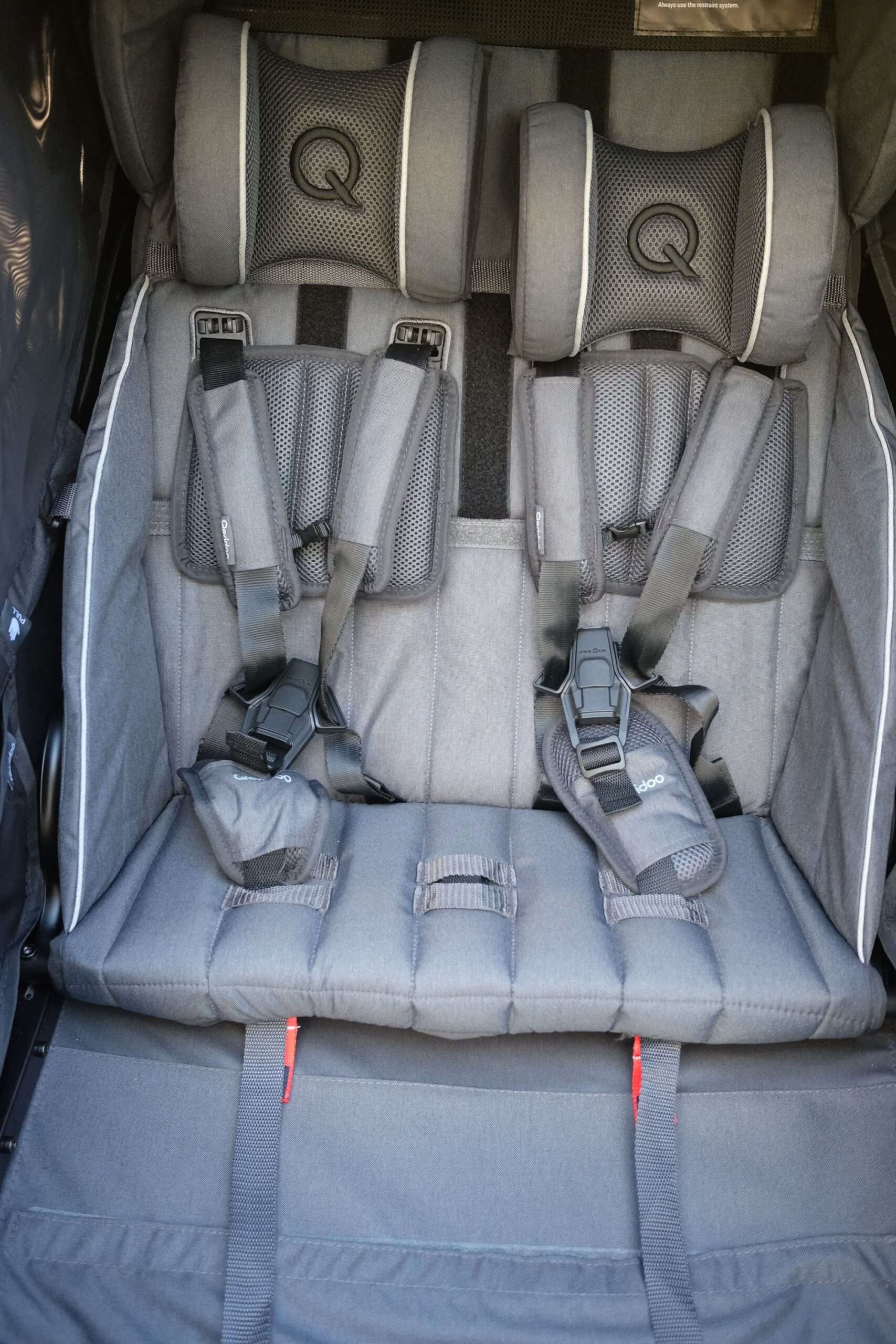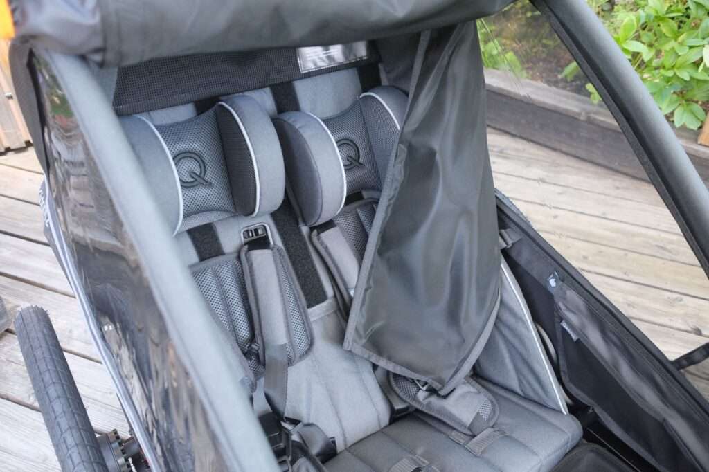 Im Innenraum des Kidgoo 2 FIDLOCK Edition zeigt sich Qeridoos Fokus auf kindgerechten Komfort. Die ergonomisch geformten Einzelsitze mit atmungsaktiven Rückenpolstern sorgen für eine stabile, gesunde Sitzposition – auch bei längeren Fahrten. Nicht möglich ist es, die Rückenlehne zu verstellen, da sehen wir definitiv Verbesserungspotenzial – gerade bei Nickerchen wäre hier noch eine höherer Komfort möglich. Qeridoo selbst erkannte dieses Verbesserungspotenzial ebenso und stellte auf der Eurobike 2025 ein neues Mobilitätskonzept vor. Kernstück ist ein komplett überarbeiteter Aluminium-Rahmen, der eine individuell verstellbare Rückenlehne pro Sitz erlaubt, ohne die schützende Rahmengeometrie zu verlassen. So verbindet das kommende Modell die Vorteile der bewährten Babyschalen-/Hängematten-Technologie mit der zusätzlichen Flexibilität für ältere Kinder.